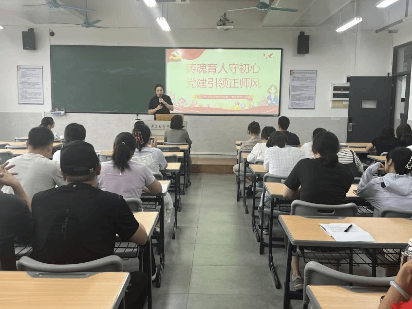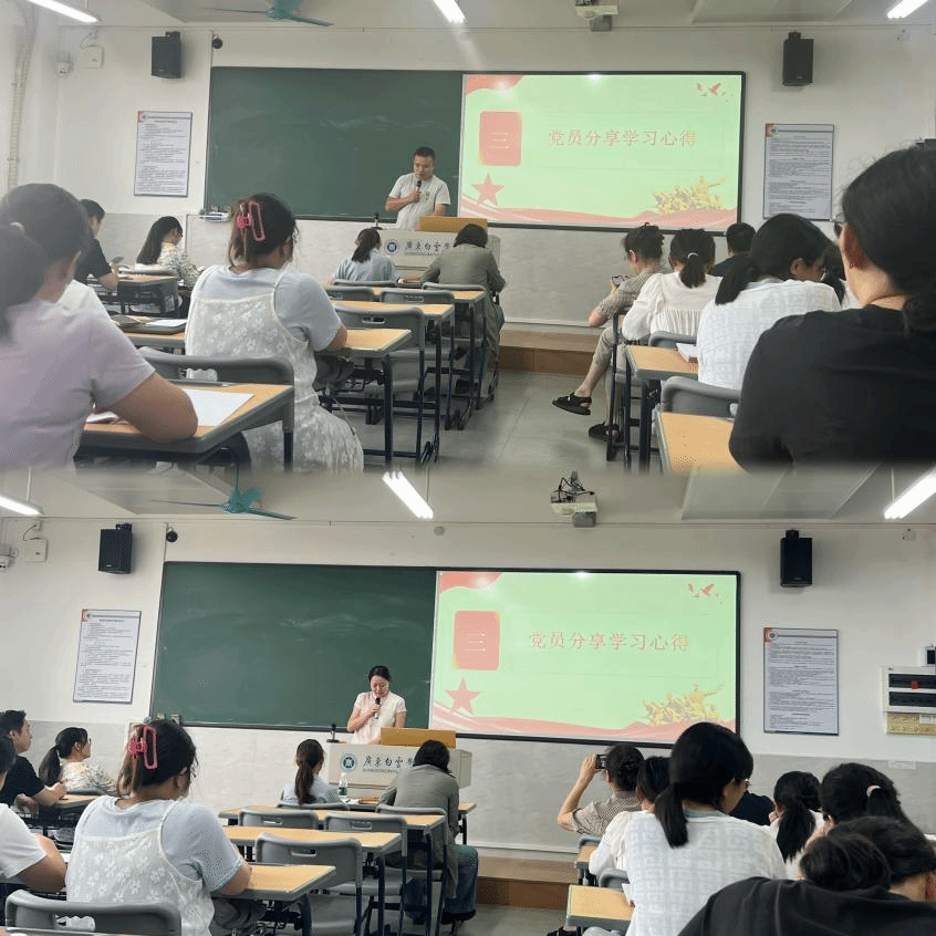 接着,学习“强师德、正师风、育新人”主题内容,引导全体党员教师深刻理解立德树人的根本要求,明确行为规范底线,自觉践行“四有”好老师标准,做到以德立身、以德立学、以德施教。在心得分享环节,胡相文和罗丽君老师积极分享了学习讲话精神和观看阅兵视频的感悟,畅谈了如何在教育教学全过程中融入爱国主义教育和价值引领,以及如何在日常言行中恪守师德、关爱学生、为人师表的体会。